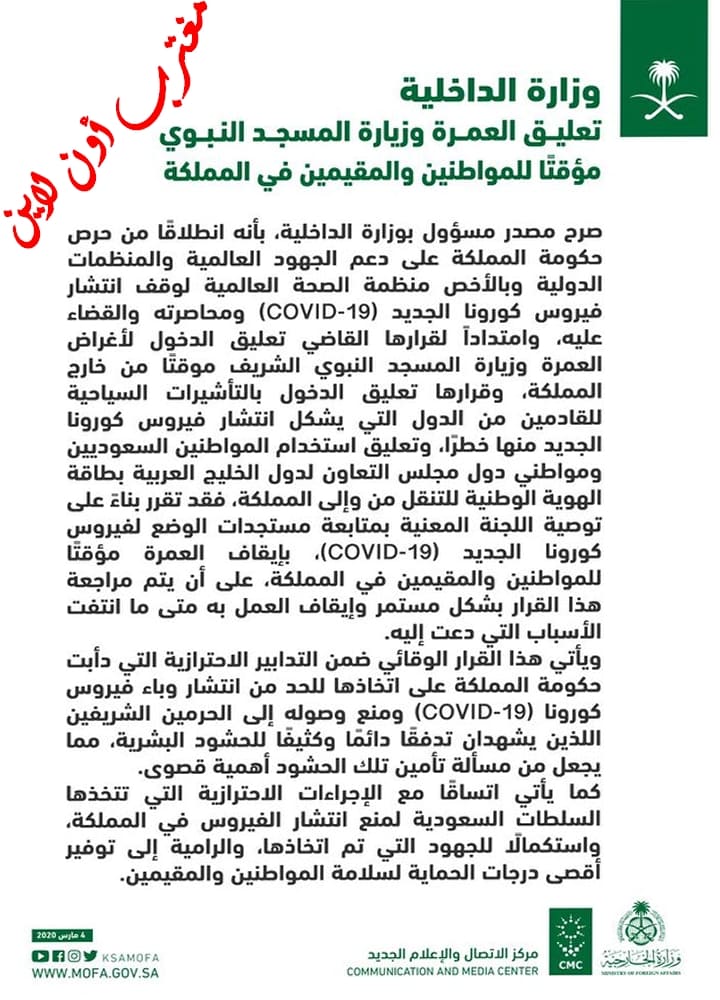 السعودية تمنع المقيمين والمواطنين من العمرة وزيارة المسجد النبوي مغترب أون لاين