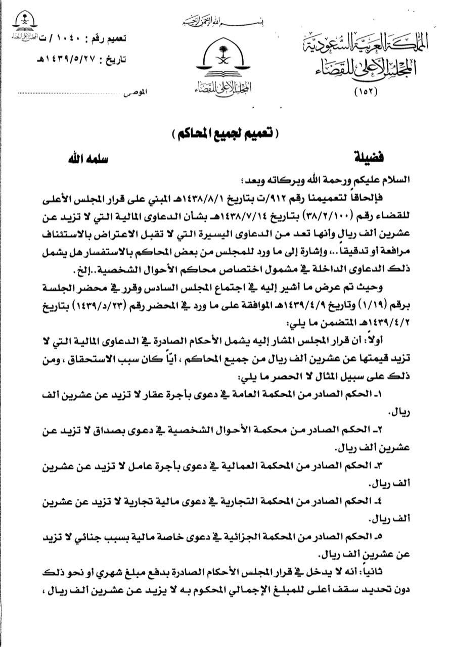 مكتبة القانون En Twitter تعميم صادر من المجلس الأعلى للقضاء بتاريخ ١٤٣٩ ٠٥ ٢٧هـ بشأن الدعاوى المالية التي لا تزيد عن عشرين ألف ريال وأنها تعد من الدعاوى اليسيرة التي لا تقبل الاعتراض بالاستئناف